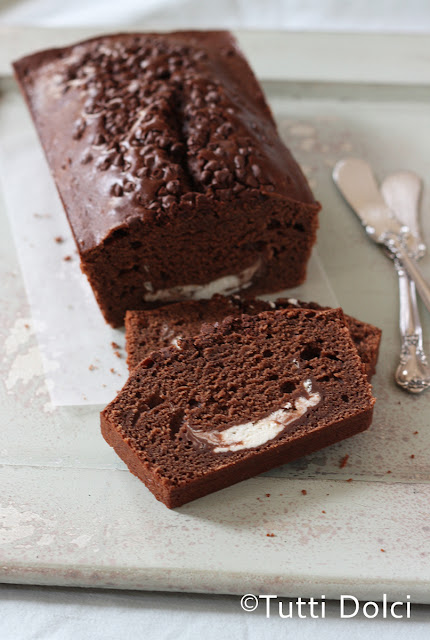 Slicing into the pound cake reveals a ribbon of tangy cream cheese that makes a nice counterpoint to the rich chocolate. A scattering of mini chocolate chips is all the adornment this cake needs.